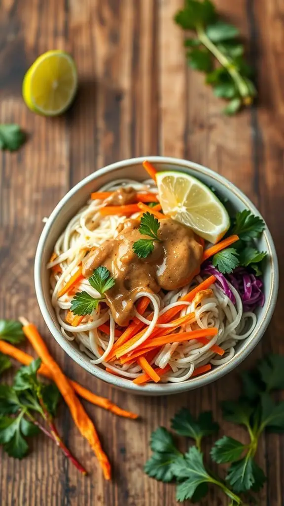 - Assemble the Bowl: In a large bowl, combine the cooked noodles, shredded carrots, red cabbage, and cucumber. Drizzle the peanut sauce over the top and toss to combine.