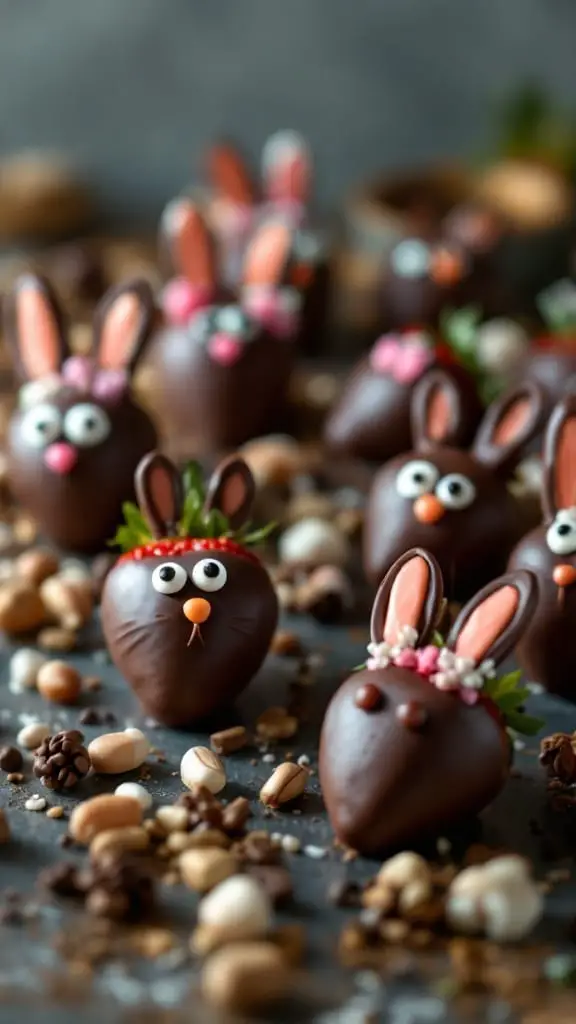 Chocolate-covered strawberries shaped like bunnies, decorated with candy eyes and pink details.