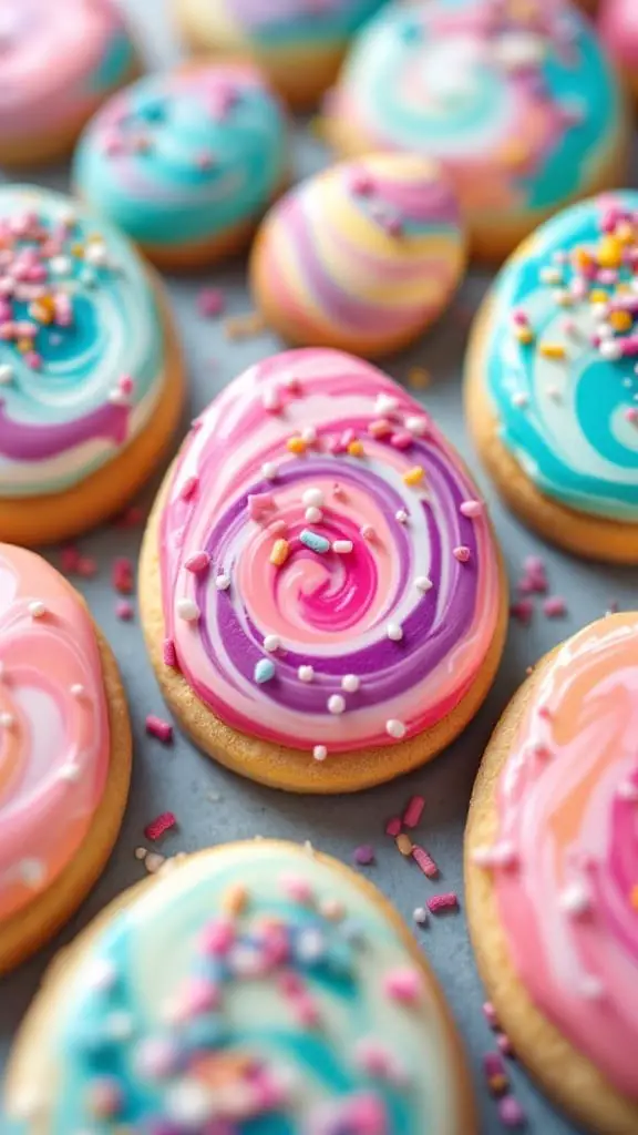 Colorful marble Easter egg cookies decorated with icing and sprinkles.
