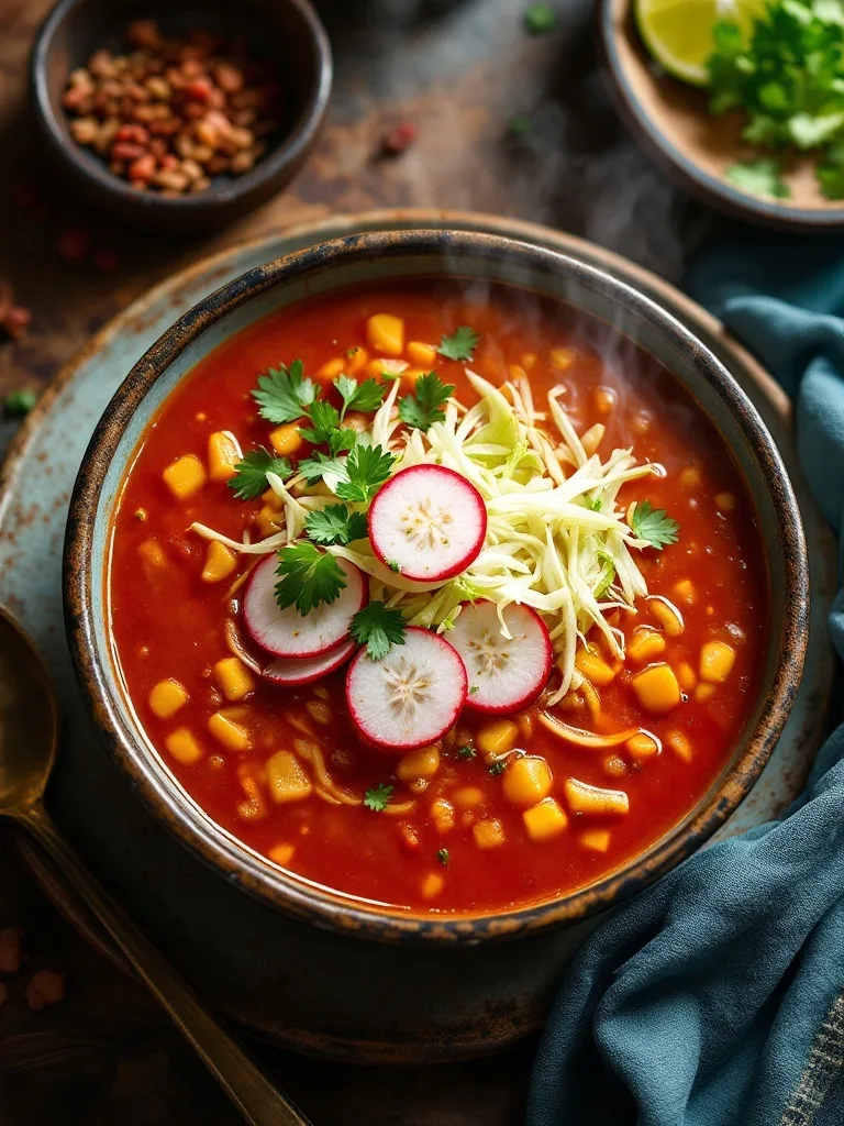 - Serve: Ladle the pozole into bowls and top with sliced radishes, cabbage, cilantro, and a squeeze of lime. Enjoy with tortilla chips or tacos on the side.
