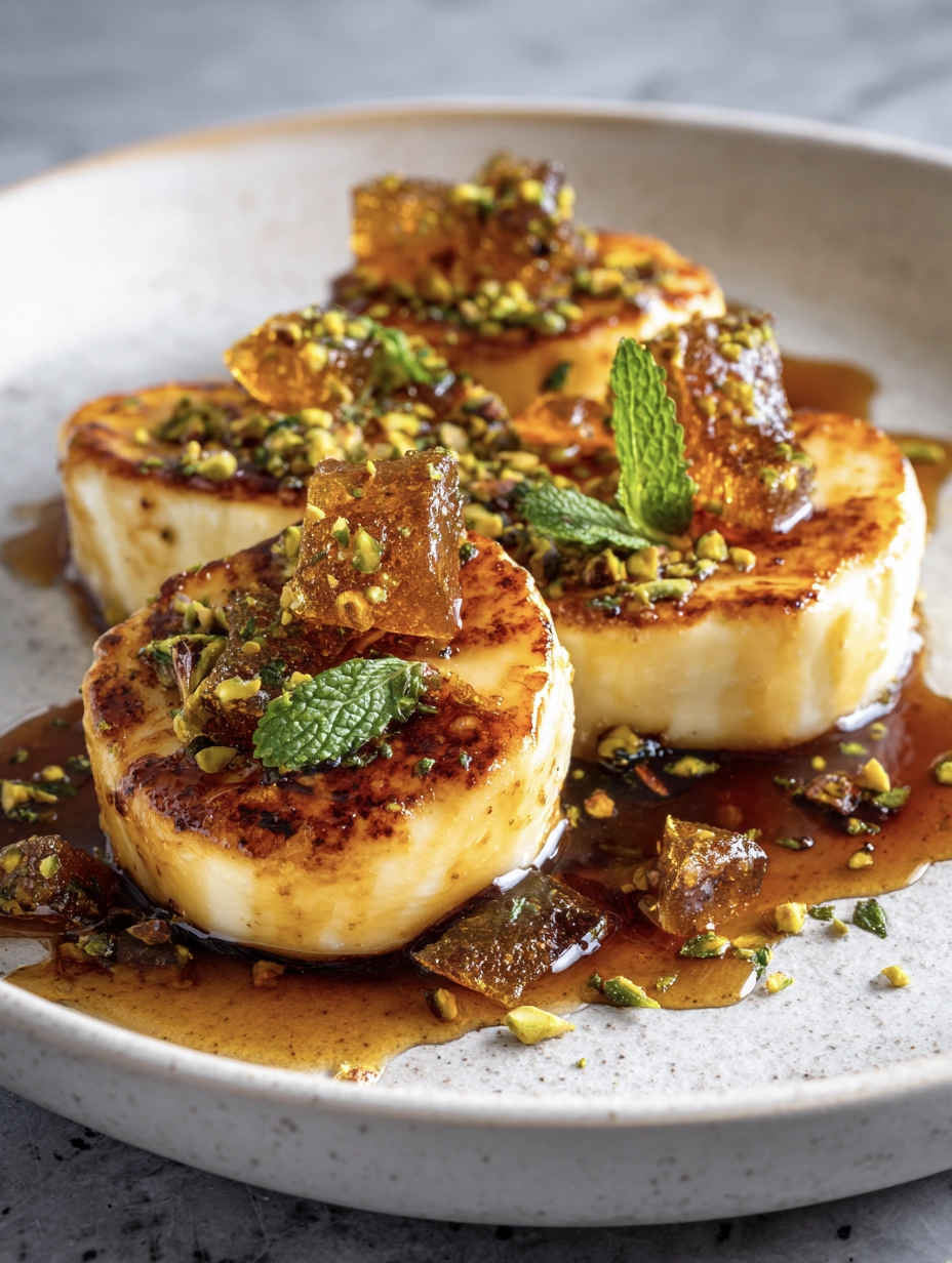 Brown-Butter Halloumi with Pistachio Praline & Orange-Blossom Honey