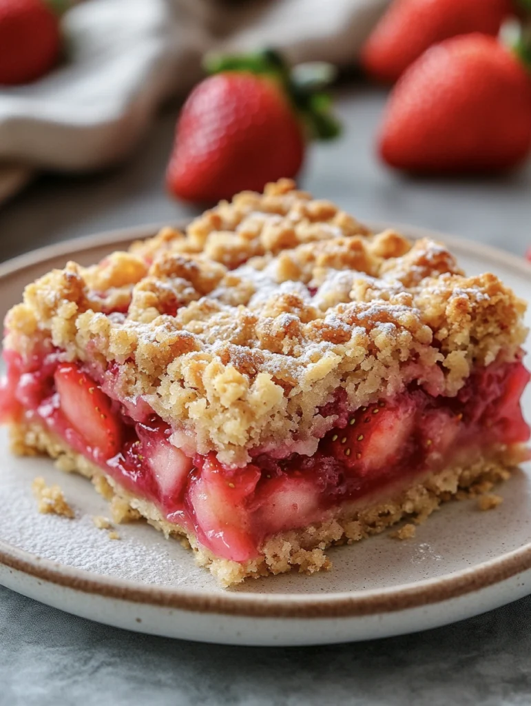 The magic here is the pairing of tart rhubarb and sweet strawberries, creating a bright, fruity filling that’s both refreshing and indulgent. The fruit is lightly sweetened and thickened with cornstarch, which helps it set into a jammy layer as it bakes. The crumble mixture is made with rolled oats, brown sugar, melted butter, and a touch of cinnamon, forming a rich, caramelized crust and topping that provides a crunchy contrast to the soft filling. The natural acidity of the rhubarb balances the sweetness, making these bars more complex and less cloying than traditional fruit desserts. A hint of vanilla in the filling rounds out the flavors, making every bite a delightful mix of sweet, tart, and buttery goodness.
