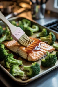 - Remove pan, brush salmon (and broccoli edges) with remaining glaze, then return to oven 8–10 minutes more, until salmon flakes easily and broccoli edges are crisp-tender.