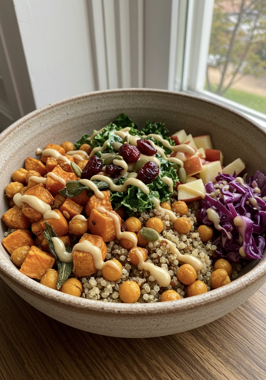 Ultimate Cozy Fall Buddha Bowl (Maple Sweet Potatoes, Sage Chickpeas & Apple-Tahini Drizzle)